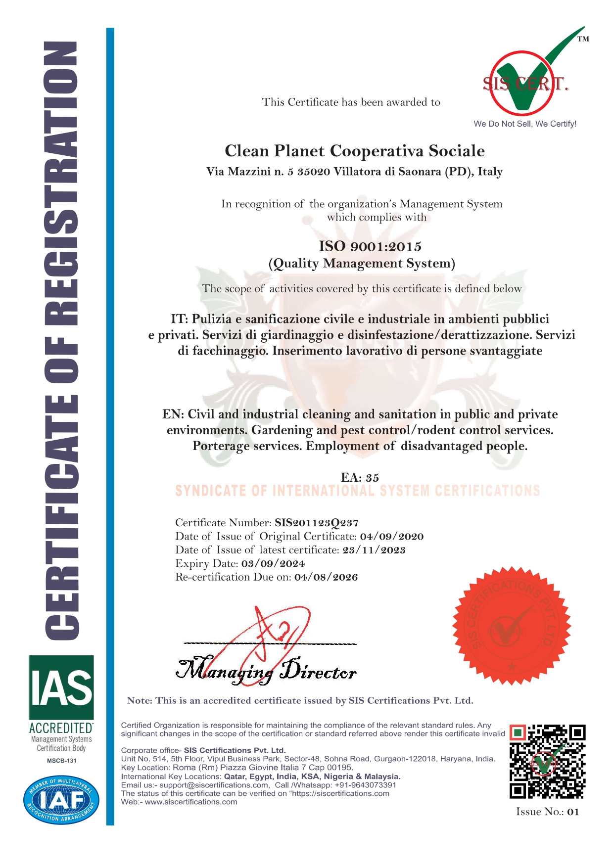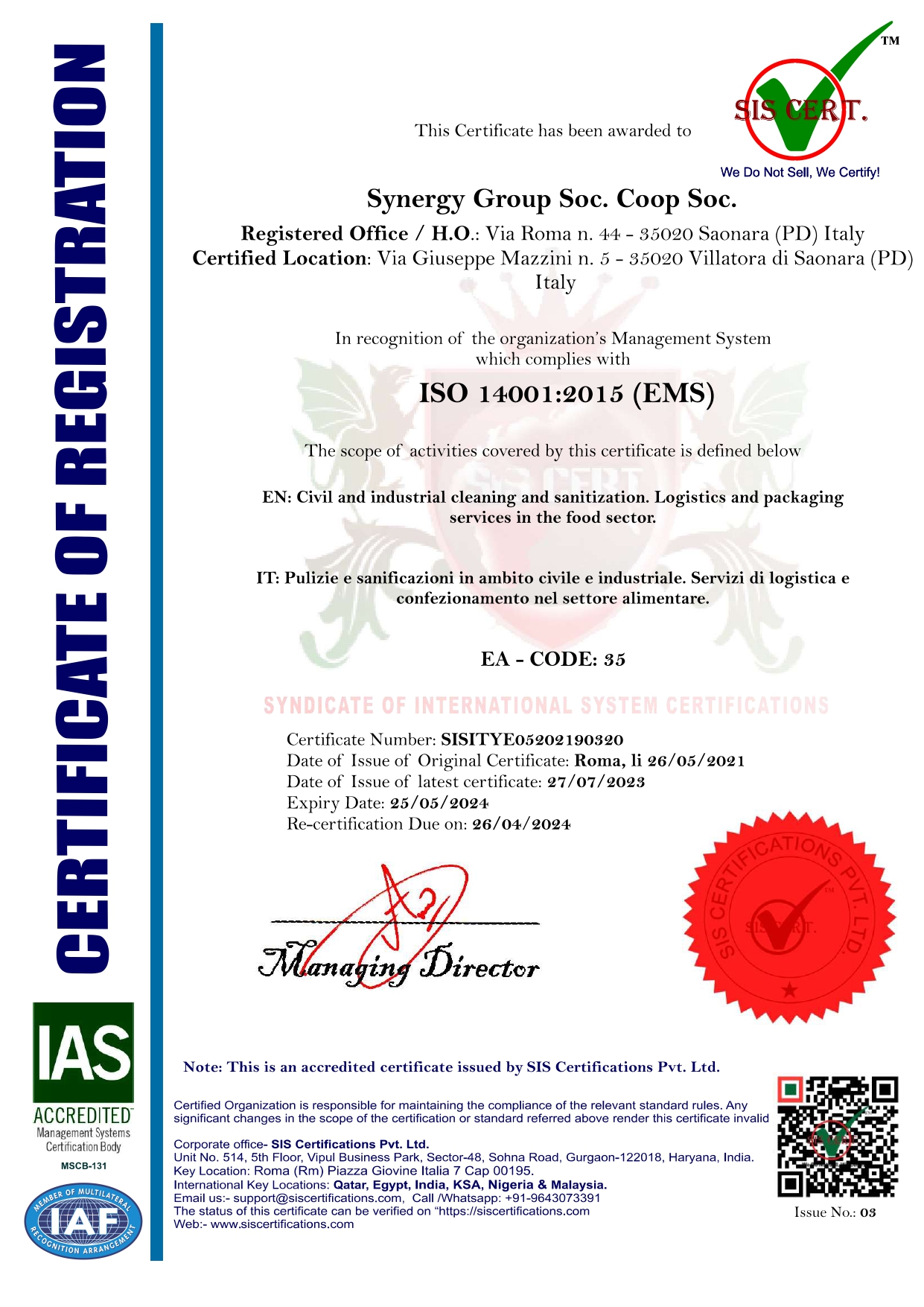 Fieri della nostra continua crescita, abbiamo implementato le competenze e le capacità professionali ottenendo le certificazioni ISO relative ai sistemi di gestione per la qualità, l’ambiente, la salute e la sicurezza sul lavoro, nonché la certificazione etica sulla responsabilità sociale d’impresa.